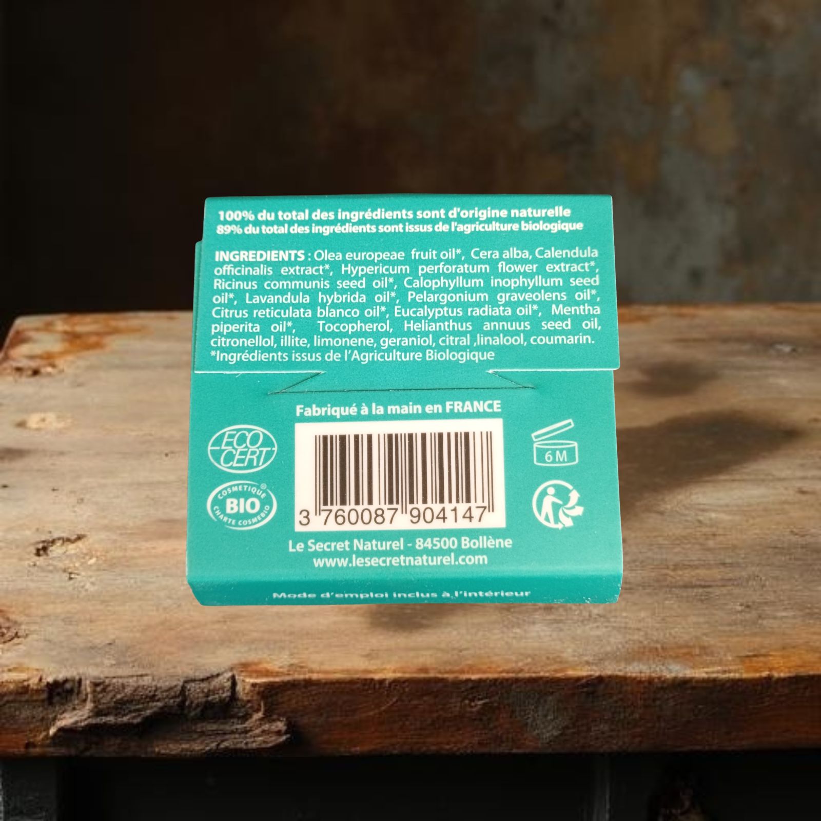 Huile d’olive*, cire d’abeille, calendula*, millepertuis*, huile vierge de ricin*, huile vierge de calophyllum*, huiles essentielles de lavandin*, de géranium*, de mandarine verte*, d’eucalyptus radiata*, de menthe poivrée*, vitamine E naturelle, huile de tournesol, argile rouge, molécules naturellement présentes dans les huiles essentielles.