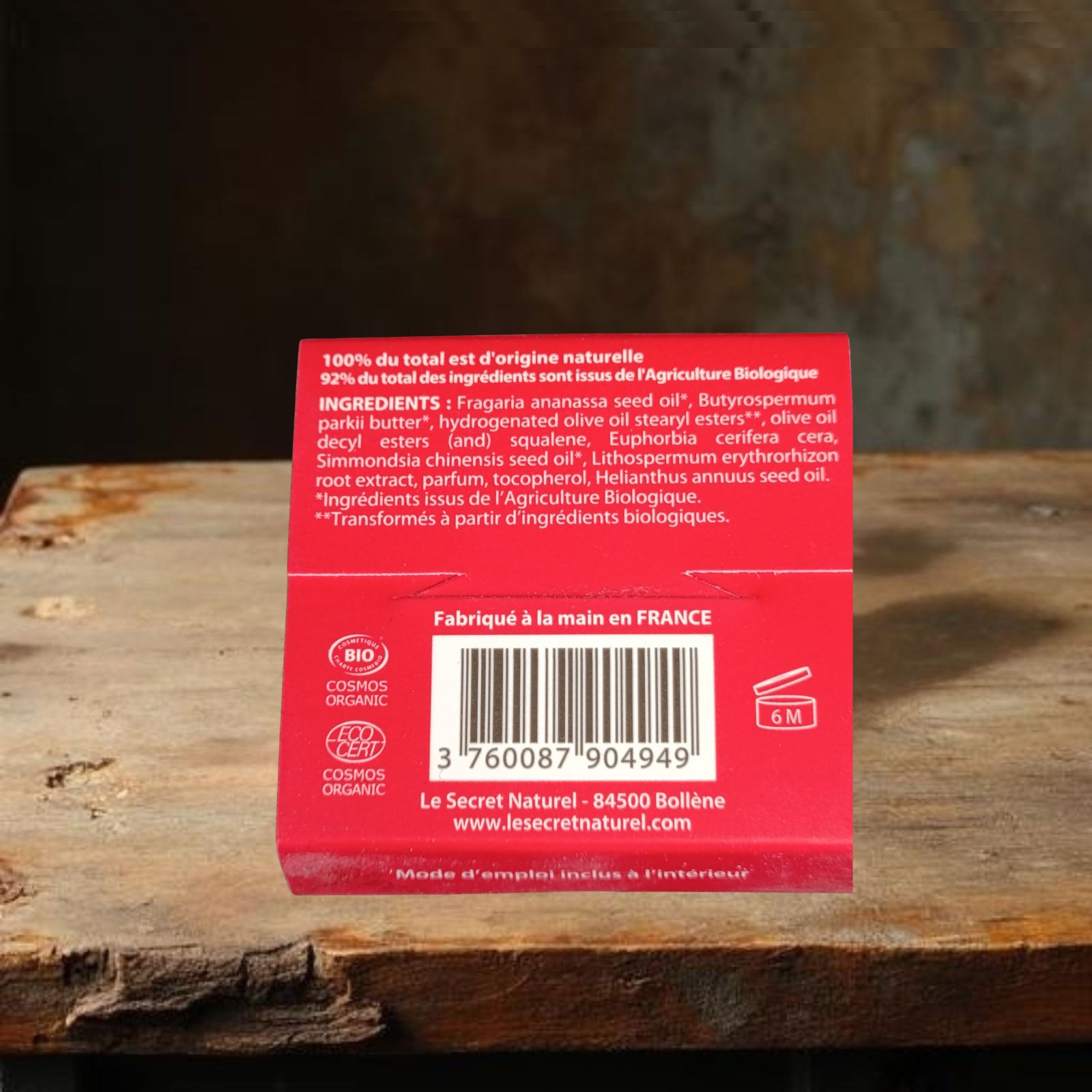 Huile de pépin de fraise biologique*, beurre de karité bio et équitable*, cire d’huile d’olive**, cire végétale de candelilla, huile de jojoba biologique*, colorant végétal, parfum, vitamine E naturelle sur base d’huile de tournesol.