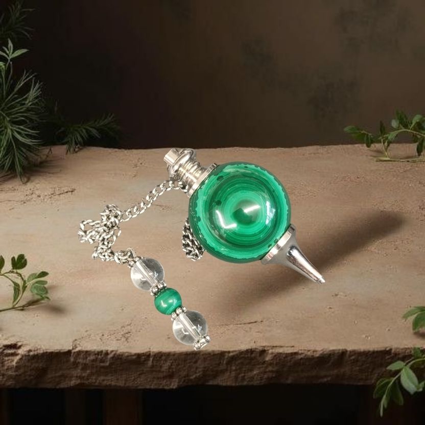 Pendule Sephoroton en Malachite naturelle avec chainette personnalisée avec 3 perles (malachite + cristal de roche)